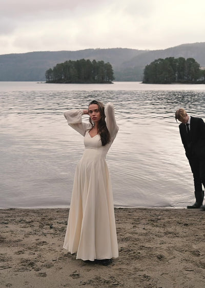 Our beloved Alette dress has become a favorite among modern brides for its elegant movement and universally flattering fit. This long-sleeve version features airy chiffon sleeves that mirror the softness of the skirt, finished with a subtle elastic cuff for a gentle, romantic drape. Structured body panels shape the waist beautifully without compromising comfort, while a hidden back zipper keeps the silhouette clean and seamless. The full skirt moves with effortless grace, creating a timeless, refined look from ceremony to celebration.